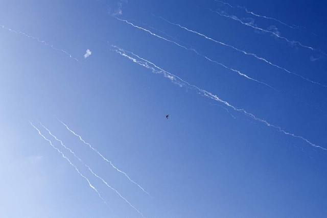 Rocket trails are seen in the sky above the Israeli coastal city of Netanya amid a fresh barrage of Iranian missile attacks on June 19, 2025. (CFP Photo)