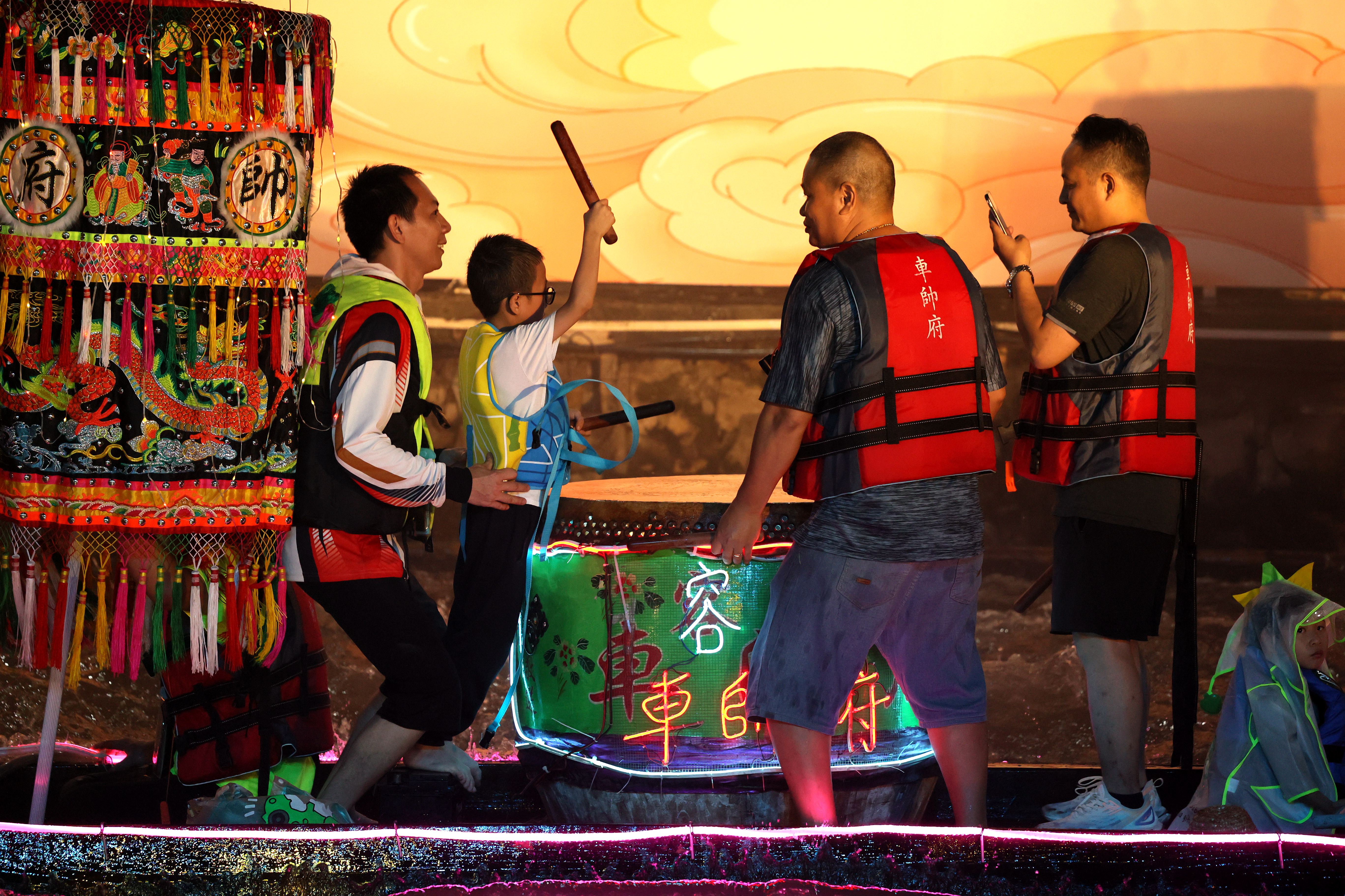 On the dragon boat, a father held his child and asked him to try to beat drums