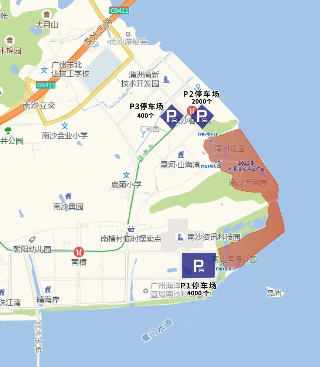 c. P3 Parking Lot (大湾区灯会P3停车场) or Nansha Passenger Port metro station (南沙客运港地铁站)