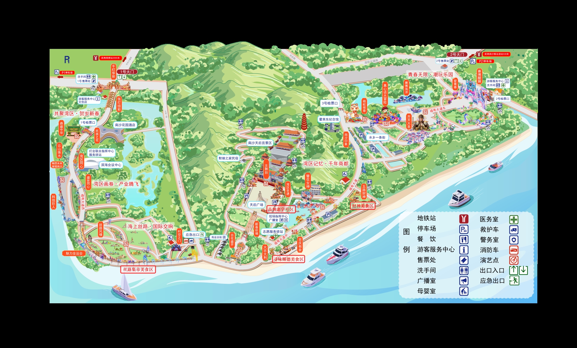 Nansha District is filled with tourist attractions. Immerse yourself in nature at Nansha Wetland Park's mangroves, savor fresh seafood at Wanqingsha, or enjoy a boat ride with stunning views of the Shenzhen-Zhongshan Link. Discover the rural charm of Dawei Village, the flower seas of Make Village, the waterways of Dongchong, and the silk heritage at Lanhe's cultural park. Also, the Nansha Cruise Terminal is just five minutes from the festival site.