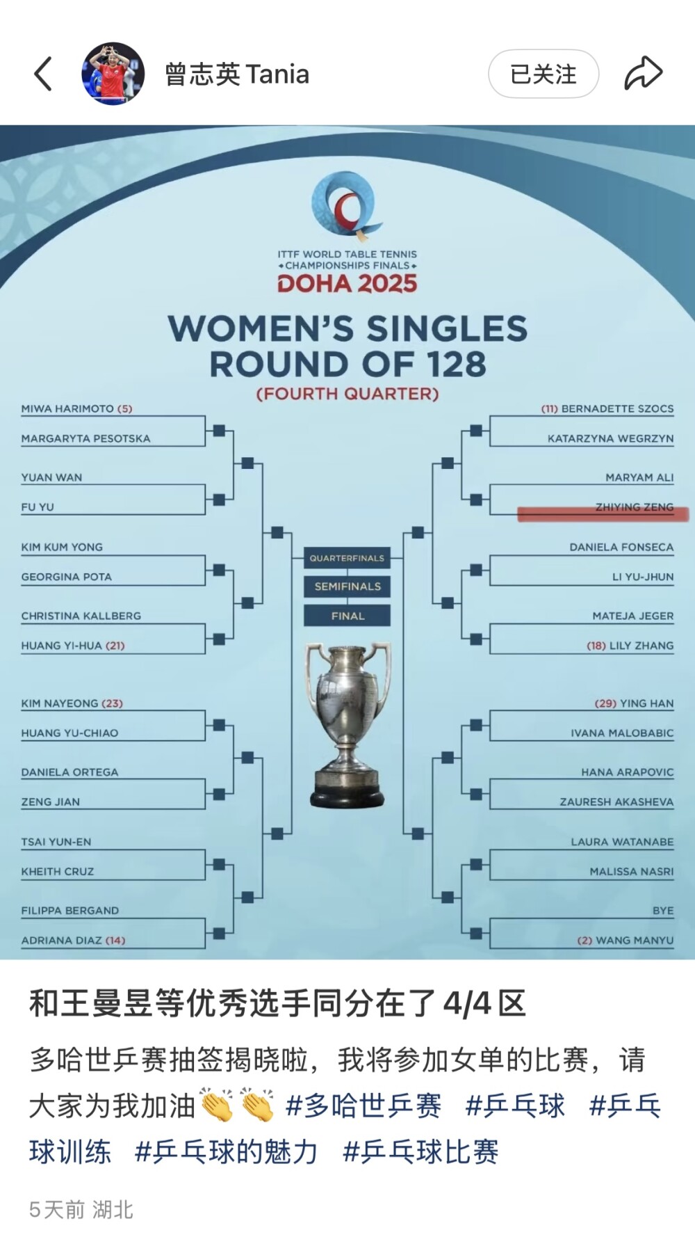 On April 30, the World Championships draw was announced, placing Zeng in the bottom half of the bracket. She wrote on Xiaohongshu (Little Red Book), "I'm in the same quarter as top players like Wang Manyu… please cheer me on!"
