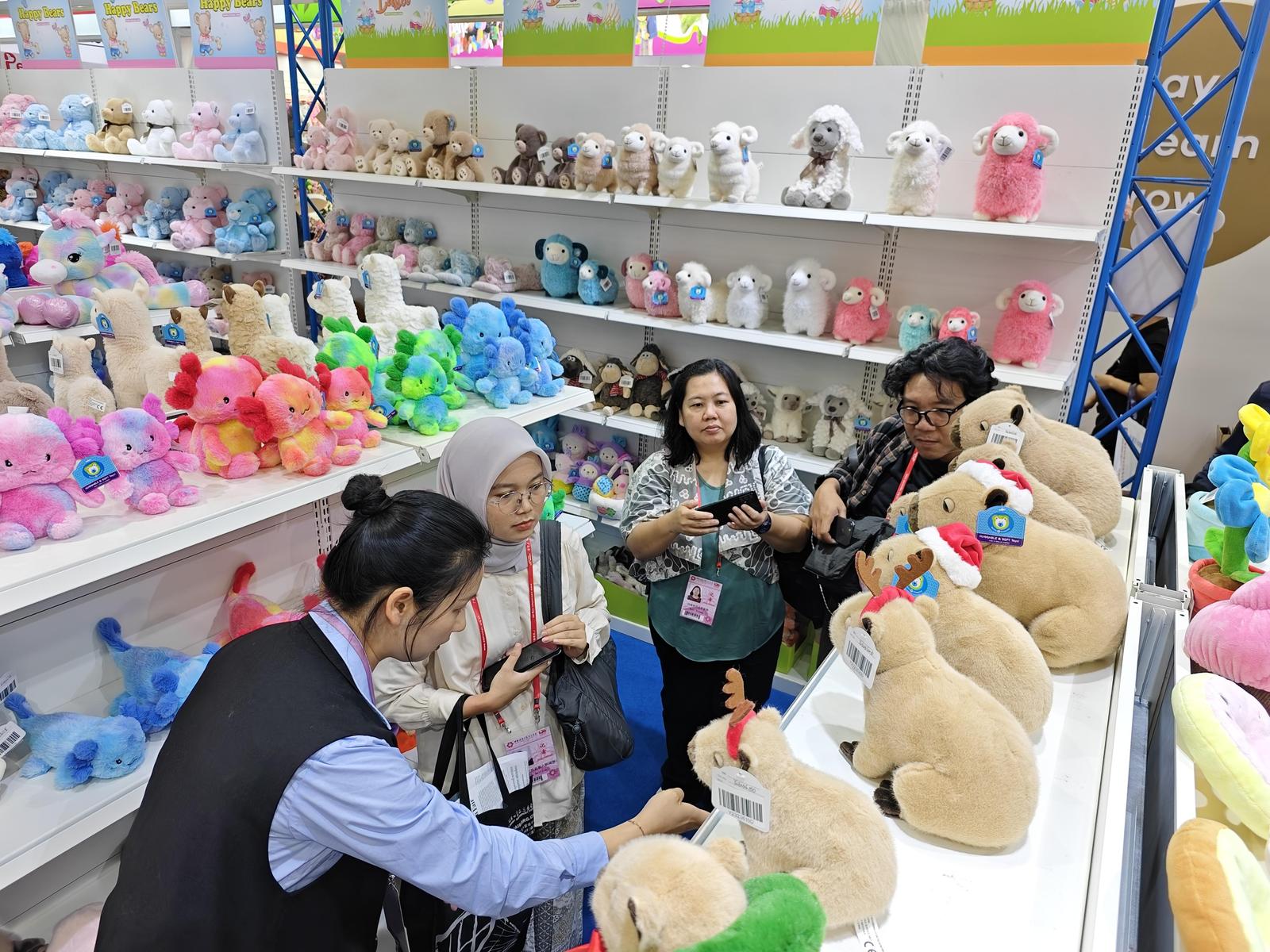 This phase of the Canton Fair, themed "Better Life," featured five major sectors: toys and maternity products, fashion, home textiles, stationery, and health and leisure, across 21 exhibition areas. At a plush toy booth from Jiangsu province, the Indonesian reporters spent considerable time learning about the company and its products, with staff emphasizing that Southeast Asia is a crucial market for them.