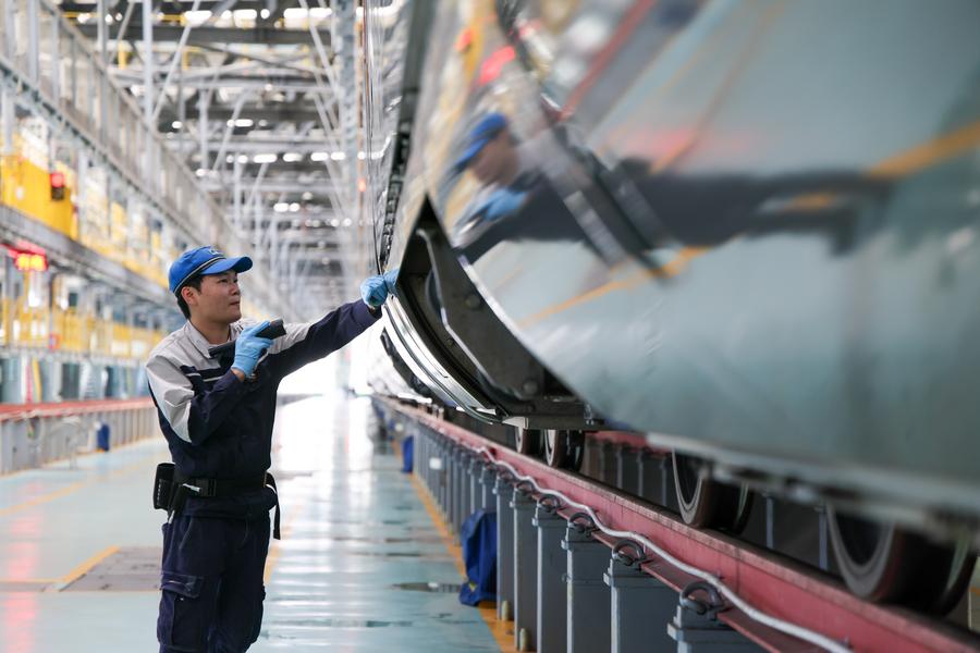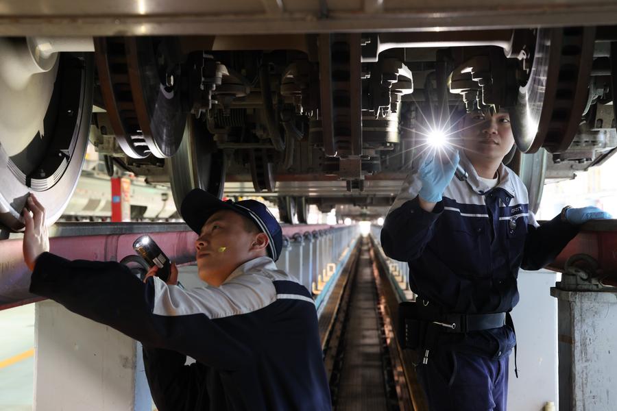 A maintenance staff inspects a high-speed sleeper train at a high-speed train depot in Shenzhen, south China's Guangdong Province, Jan. 17, 2025. (Xinhua/Mao Siqian)