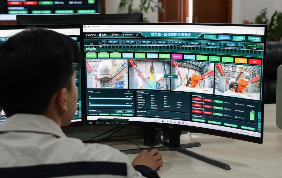 A maintenance staff inspects a high-speed sleeper train remotely with an intelligent car bottom robot at a high-speed train depot in Shenzhen, south China's Guangdong Province, Jan. 17, 2025. (Xinhua/Mao Siqian)
