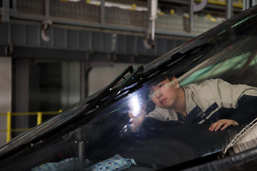 A maintenance staff inspects the cab of a high-speed sleeper train at a high-speed train depot in Shenzhen, south China's Guangdong Province, Jan. 17, 2025.(Xinhua/Mao Siqian)