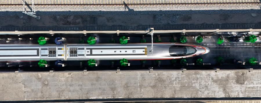 An automatic car washing system operates at a high-speed train depot in Shenzhen, south China's Guangdong Province, Jan. 17, 2025. (Xinhua/Mao Siqian)