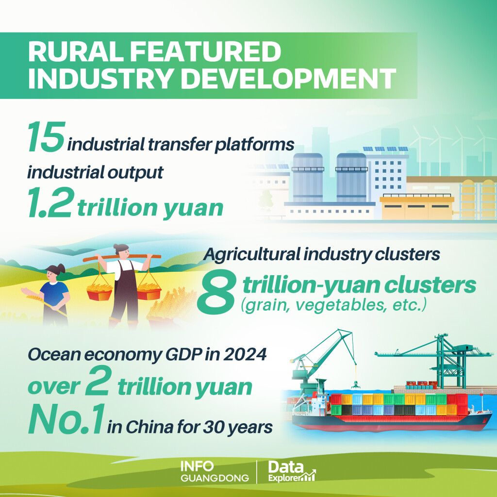 Guangdong has fostered eight trillion-yuan-level agricultural industry clusters, covering sectors such as grain and vegetables, alongside 17 hundred-billion-yuan clusters in areas including tea and flowers. The province also created 51 key towns and villages for rural tourism nationwide, 72 beautiful leisure villages, and 365 provincial characteristic villages. Meanwhile, Guangdong's marine economy output exceeded 2 trillion yuan in 2024, ranking first in China for 30 consecutive years.