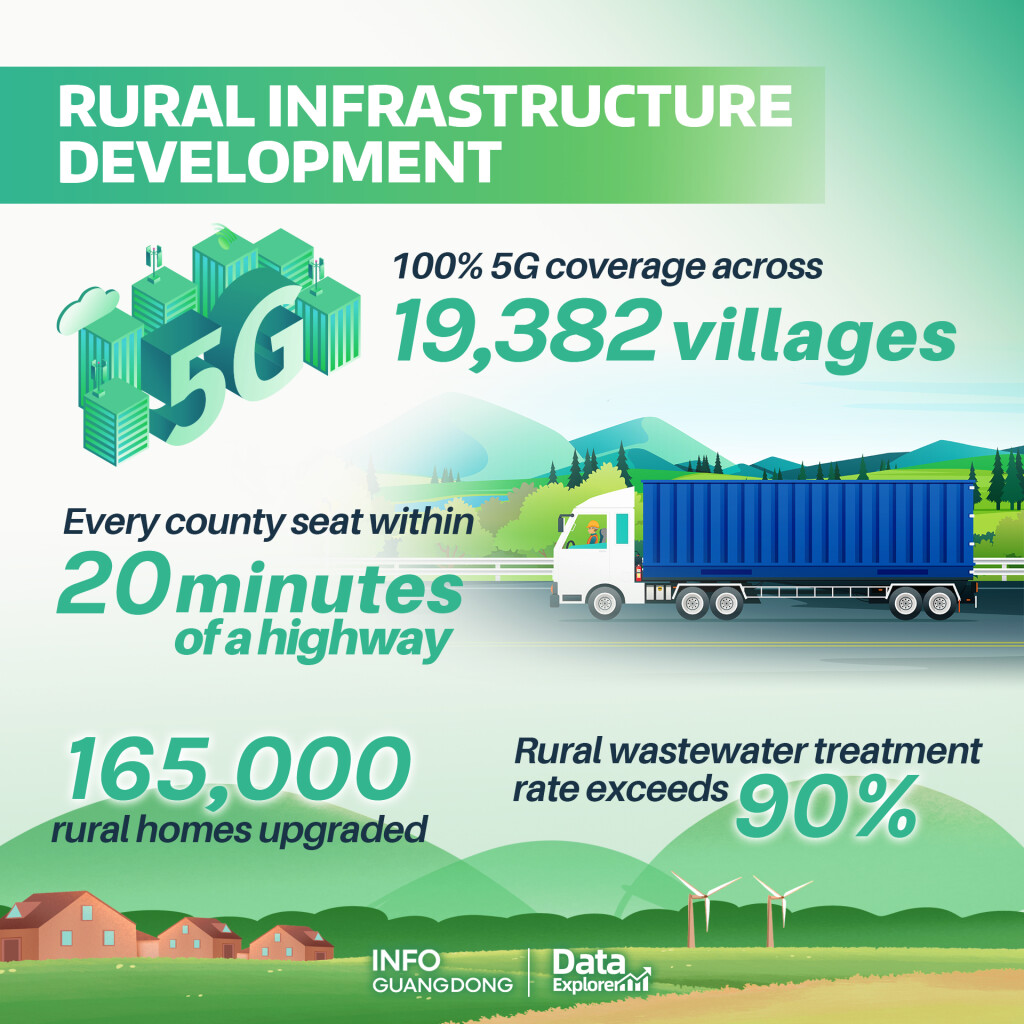 Infrastructure upgrades and public services have also been enhanced in this process. County seats across the province are now generally within 20 minutes of expressway access. A total of 155 senior high schools in the Pearl River Delta have been paired to support 227 county-level schools, while 104 top-tier provincial hospitals have been paired to assist 172 county hospitals. All 19,382 administrative villages now have full 5G coverage. Approximately 165,000 rural homes have undergone quality upgrades, and the rural wastewater treatment rate in natural villages has risen to over 90 percent.