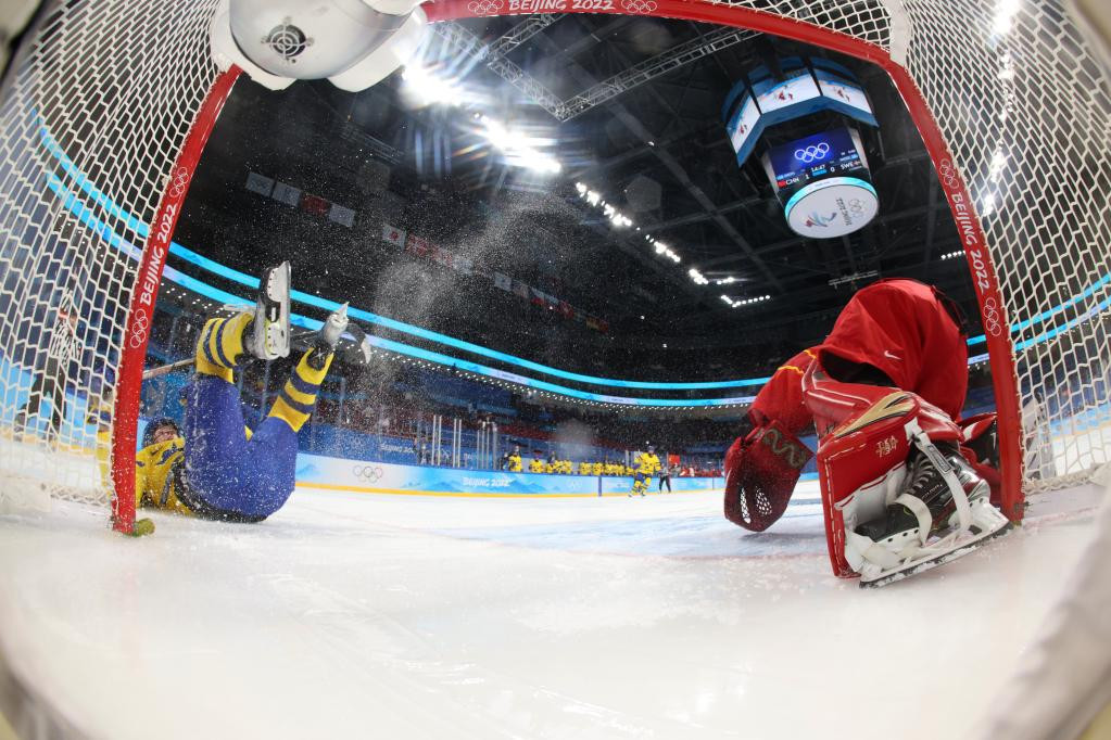 Sara Hjalmarsson (L) of Sweden clashes with the gate during the ice hockey women's preliminary round Group B match between China and Sweden at Wukesong Sports Centre in Beijing, capital of China, Feb. 7, 2022. (Xinhua/Song Yanhua)