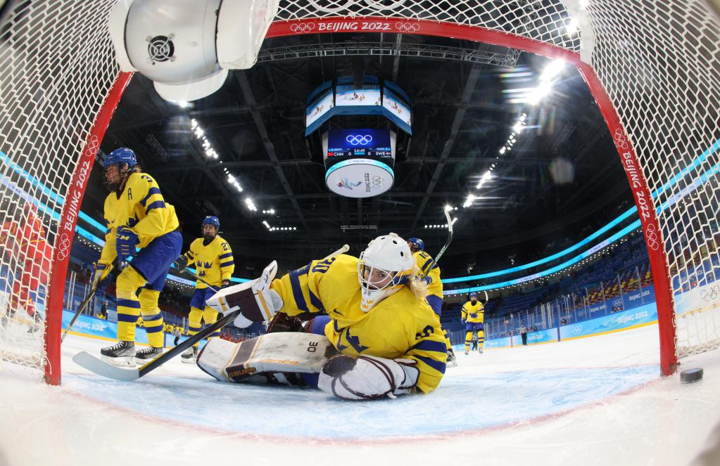 Goalkeeper Emma Soderberg (front) of Sweden misses a goal during the ice hockey women's preliminary round Group B match between China and Sweden at Wukesong Sports Centre in Beijing, capital of China, Feb. 7, 2022. (Xinhua/Song Yanhua)