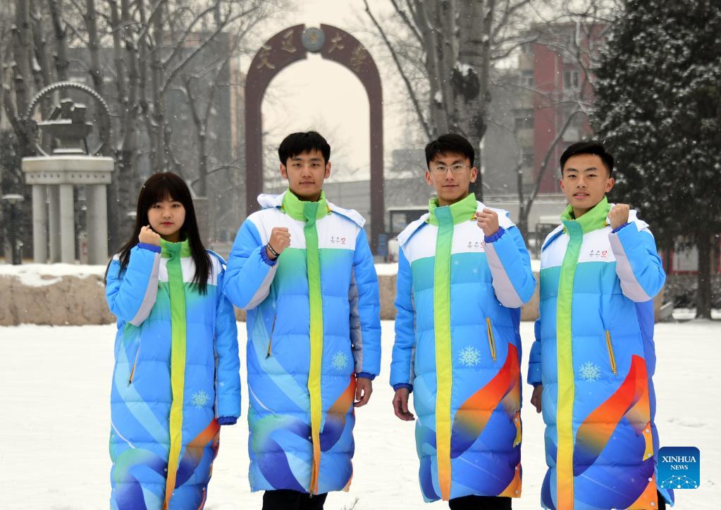 Beijing 2022 Winter Olympics and Paralympics volunteers from Beijing Jiaotong University pose for photos on campus in Beijing, capital of China, Jan. 22, 2022. (Xinhua/Ren Chao)