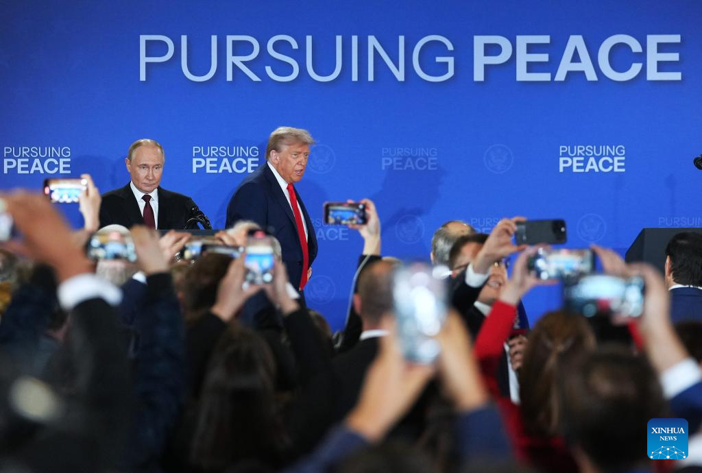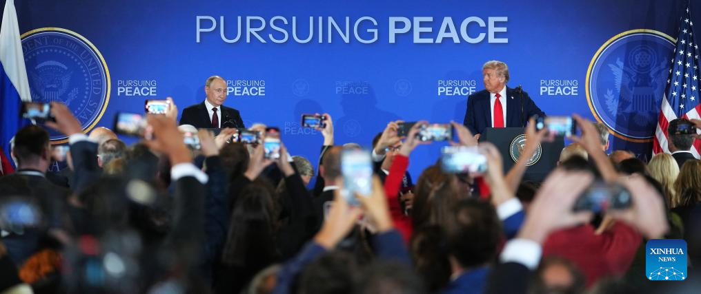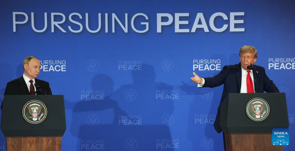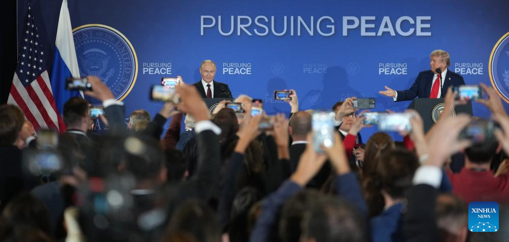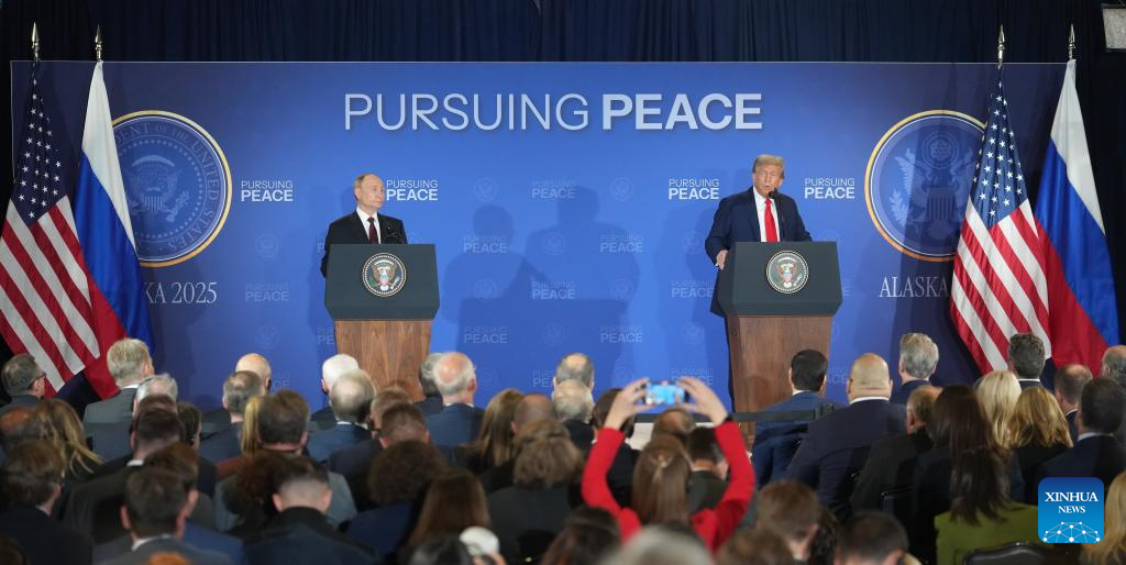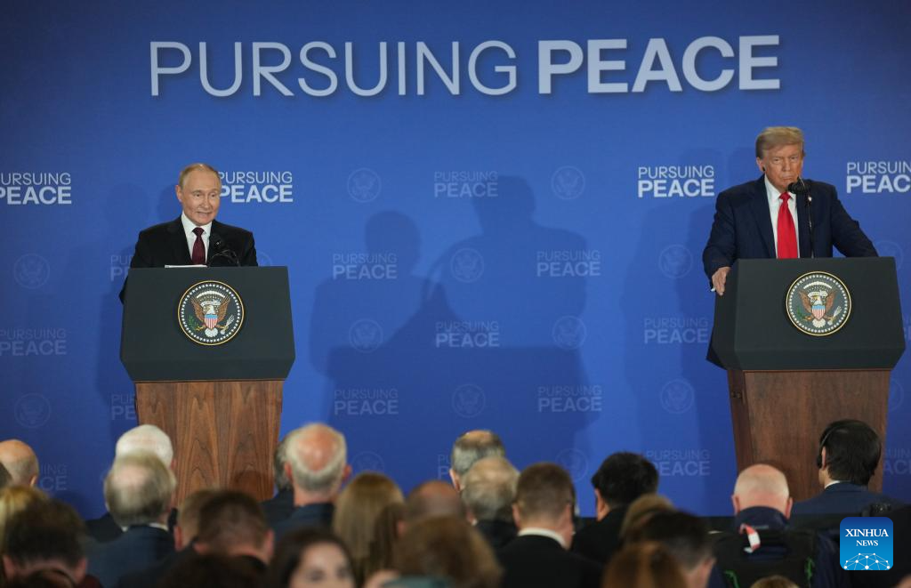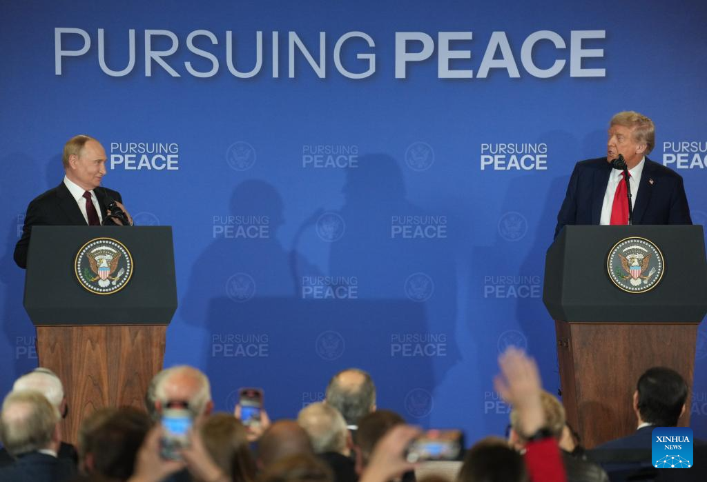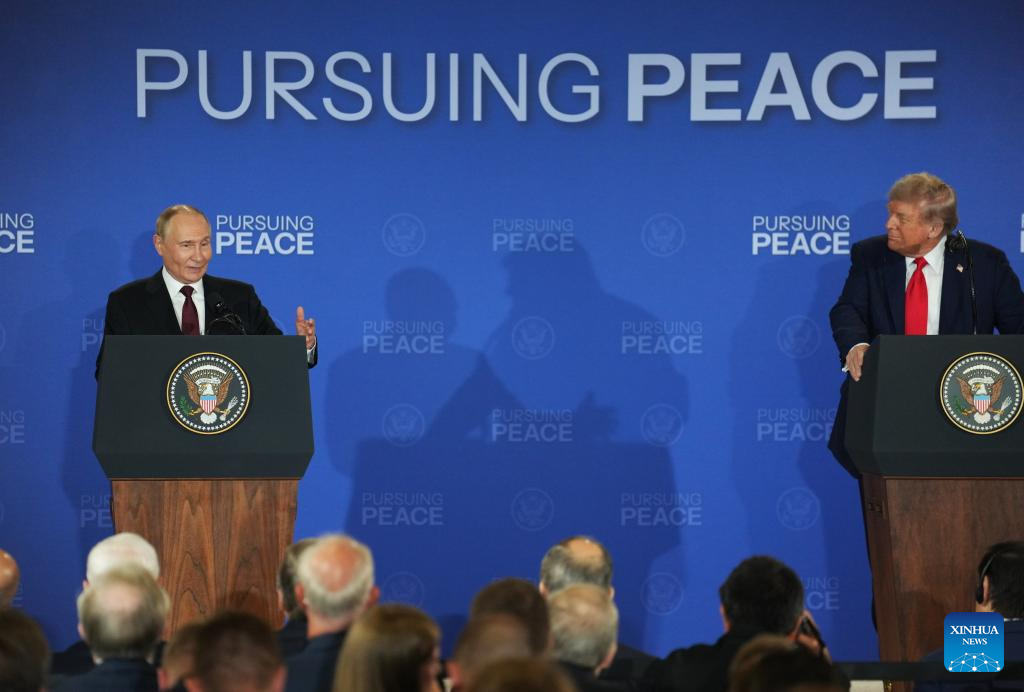 Russian President Vladimir Putin (L) addresses a joint press conference with U.S. President Donald Trump after concluding their talks in Anchorage, Alaska, the United States, on Aug. 15, 2025.The talks, held at Joint Base Elmendorf-Richardson in the city of Anchorage, lasted about three hours. (Xinhua/Wu Xiaoling)
