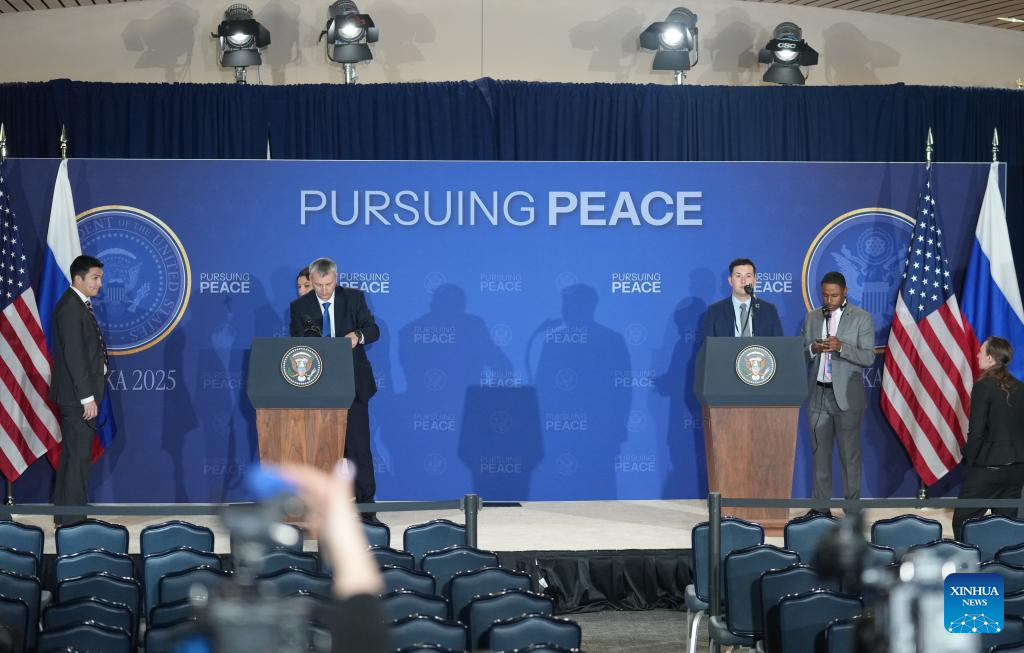 U.S. President Donald Trump (R, Rear) and Russian President Vladimir Putin (L, Rear) attend a joint press conference after concluding their talks in Anchorage, Alaska, the United States, on Aug. 15, 2025.The talks, held at Joint Base Elmendorf-Richardson in the city of Anchorage, lasted about three hours. (Xinhua/Wu Xiaoling)