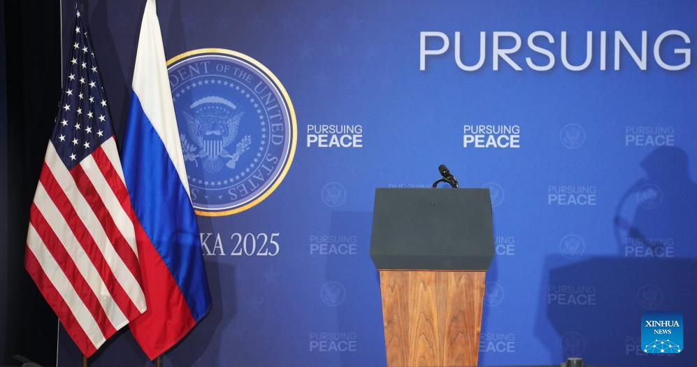 Russian President Vladimir Putin addresses a joint press conference with U.S. President Donald Trump (not in the picture) after concluding their talks in Anchorage, Alaska, the United States, on Aug. 15, 2025.The talks, held at Joint Base Elmendorf-Richardson in the city of Anchorage, lasted about three hours. (Xinhua/Wu Xiaoling)