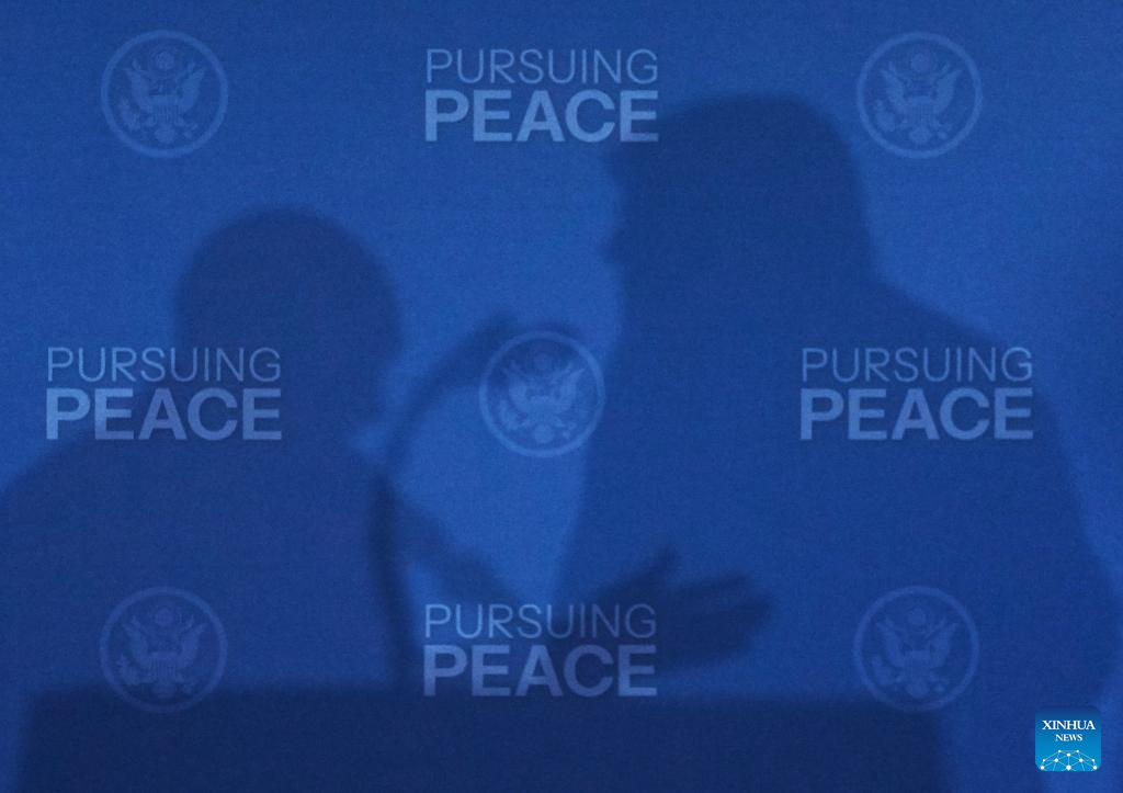 Shadows of U.S. President Donald Trump (R) and Russian President Vladimir Putin are seen as they attend a joint press conference after concluding their talks in Anchorage, Alaska, the United States, on Aug. 15, 2025.The talks, held at Joint Base Elmendorf-Richardson in the city of Anchorage, lasted about three hours. (Xinhua/Wu Xiaoling)