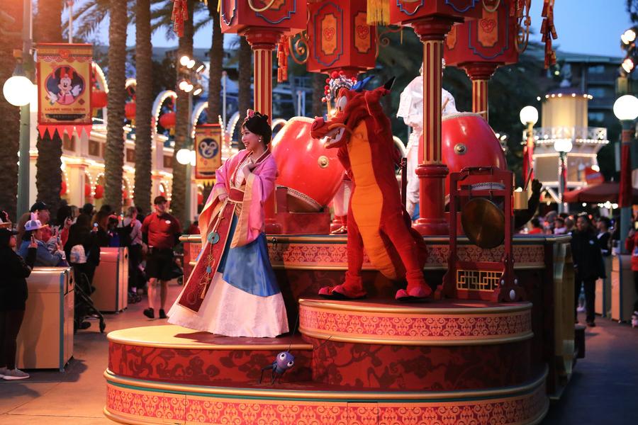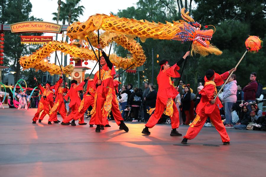 The park, located in Anaheim, Southern California, is adorned in brilliant red and gold, symbolizing good luck, health and prosperity. The annual celebrations have drawn visitors around the world in recent years.