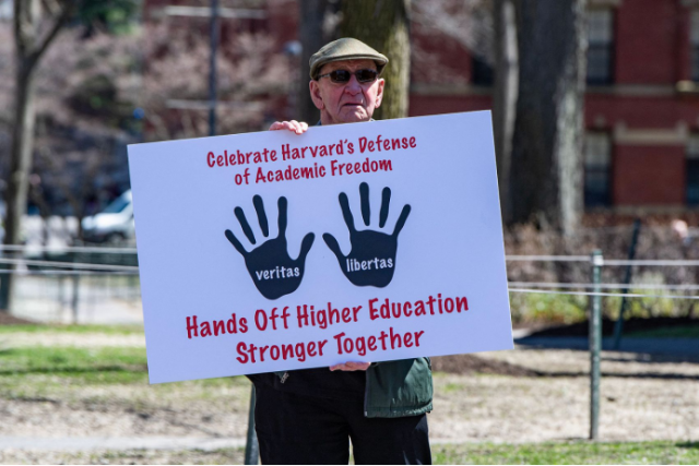 A Harvard faculty member holds a sign as he exits Harvard Yard after a rally against President Donald Trump's attacks on Harvard University in Cambridge. (Photo: CFP)