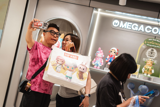 A couple poses for a selfie with their Pop Mart shopping bag at a Pop Mart store in Bangkok on July 21, 2025. (Photo: CFP)