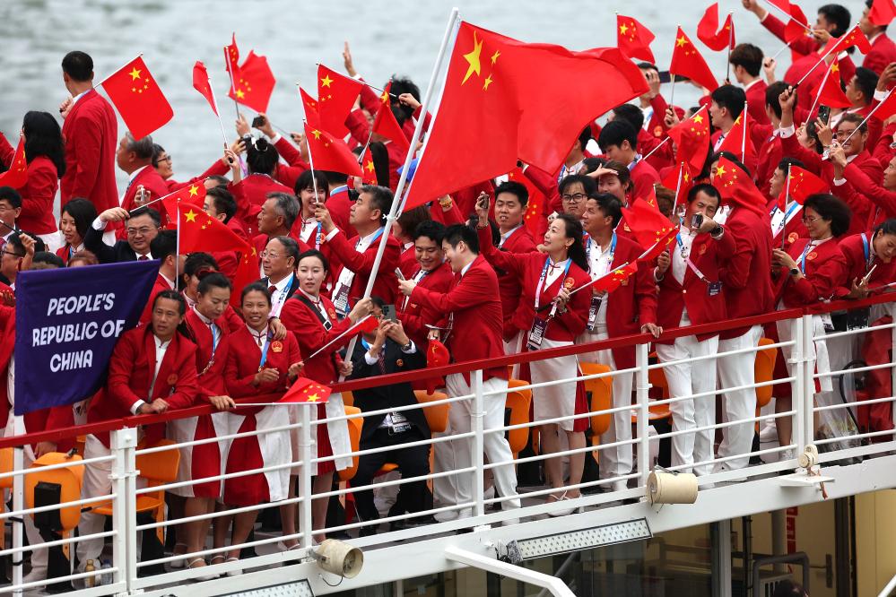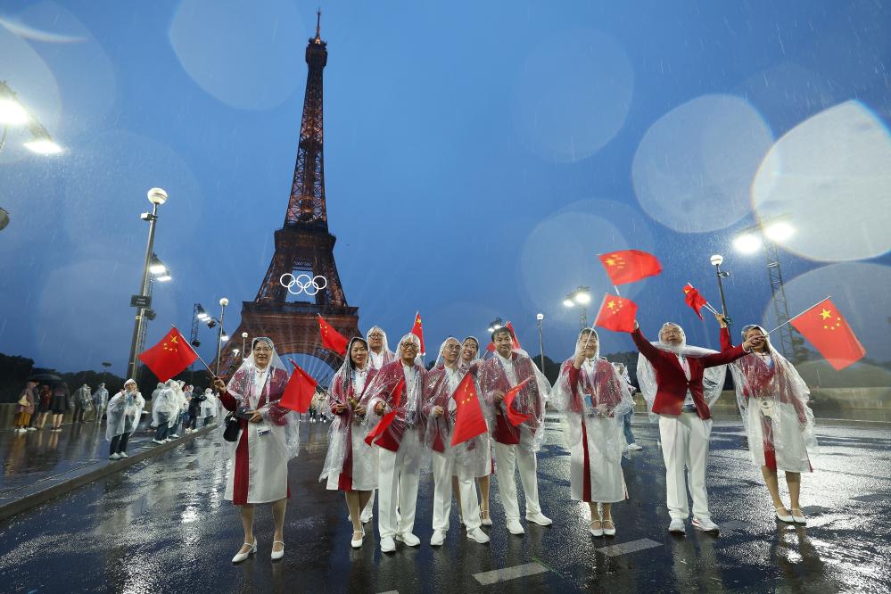 Members of the Chinese delegation attend the opening ceremony of the Paris 2024 Olympic Games in Paris, France, July 26, 2024. (Photo by Cao Can/POOL/Xinhua)
