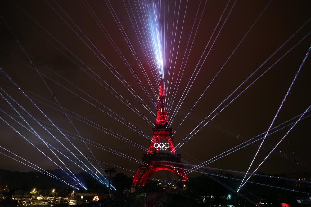 A light show is seen at the Eiffel Tower during the opening ceremony of the Paris 2024 Olympic Games in Paris, France, July 26, 2024. (Xinhua/Shen Bohan)