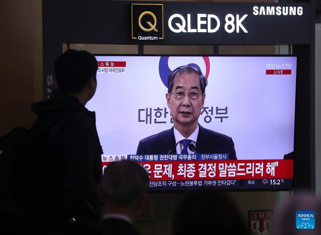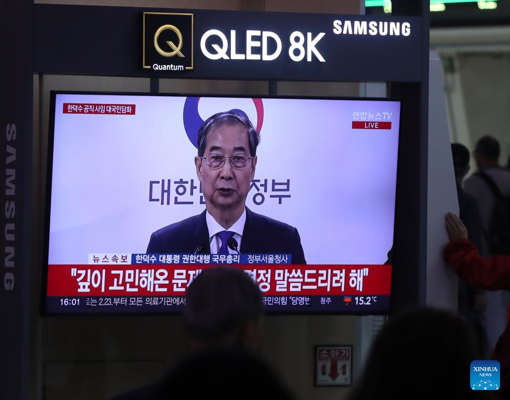 People watch a televised address by Han Duck-soo at Seoul Railway Station in Seoul, South Korea, May 1, 2025. South Korea's acting president and Prime Minister Han Duck-soo announced his resignation on Thursday in a televised address to the nation. (Xinhua/Yao Qilin)