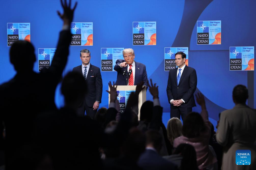 U.S. President Donald Trump (C) attends a press conference following the NATO summit in The Hague, the Netherlands, on June 25, 2025. Trump said here on Wednesday that the United States will hold talks with Iran next week. (Xinhua/Zhao Dingzhe)