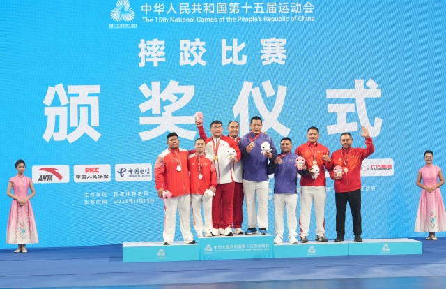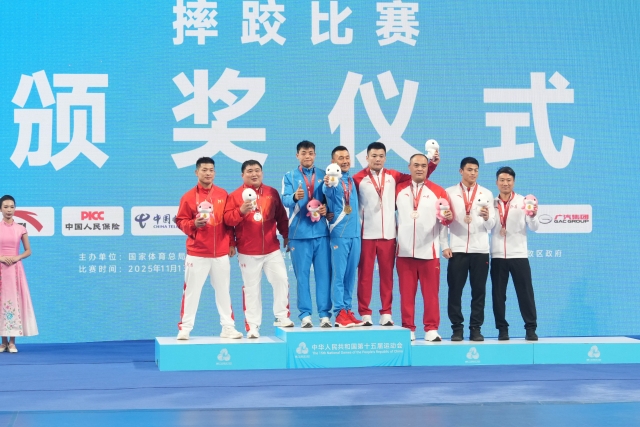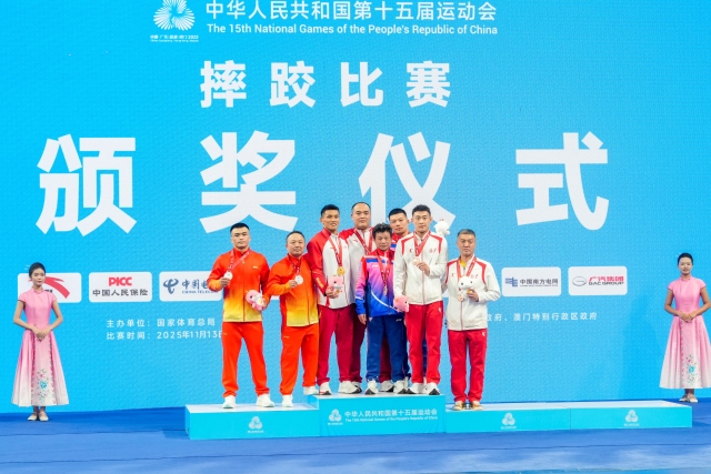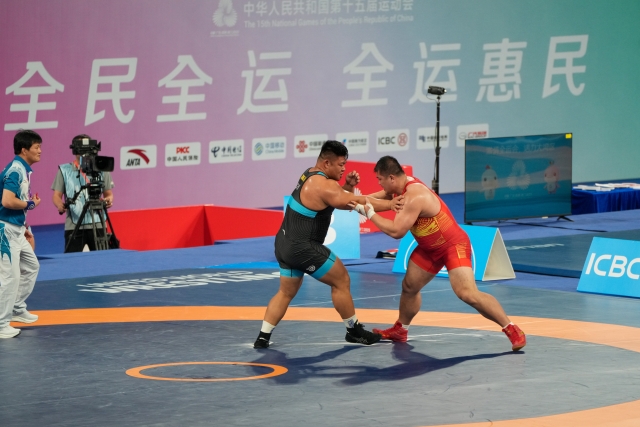 The final competition day of wrestling events at the 15th National Games unfolds at the Qingyuan Sports Center.