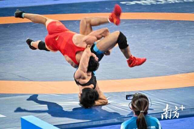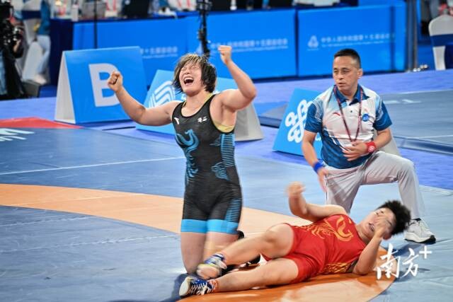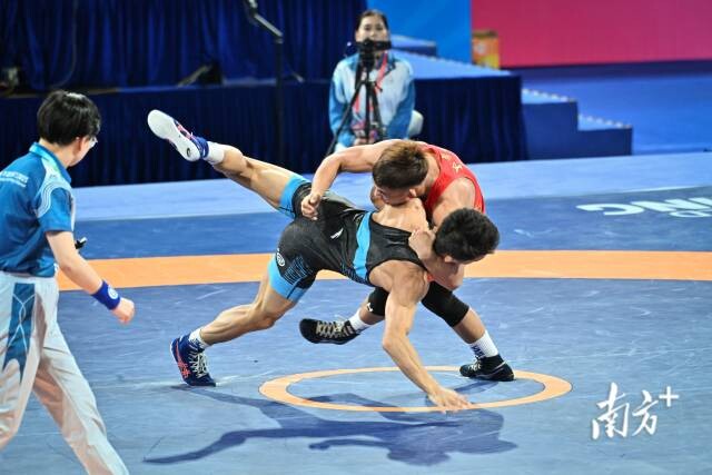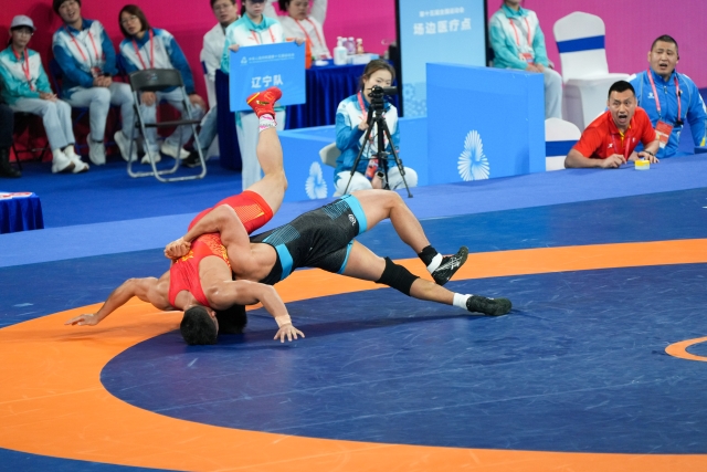 In the men's Greco-Roman 87kg final, Zheng Shichang of Liaoning (blue) defeats his opponent to claim the gold medal.