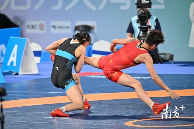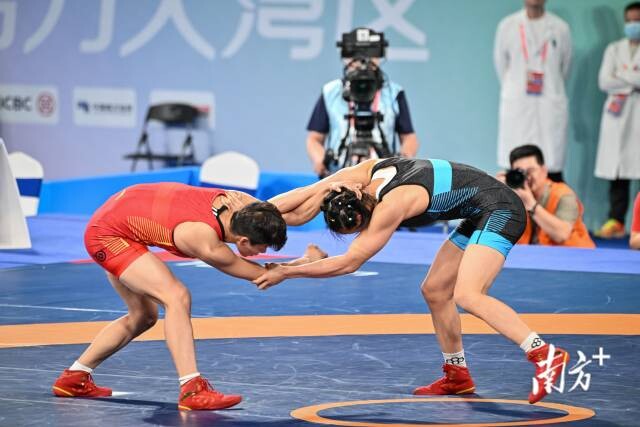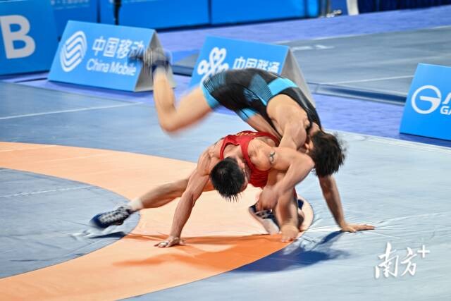 In the men's Greco-Roman 60kg final, Cao Liguo of Guangxi (red) and Tan Haodong of Wuhan Sports University (blue) fight in a tense showdown.