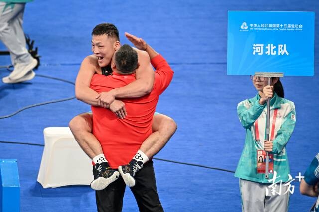 In the men's freestyle 86kg final, Li Peilong of Hebei claims the gold medal and leaps into his coach's arms in excitement.