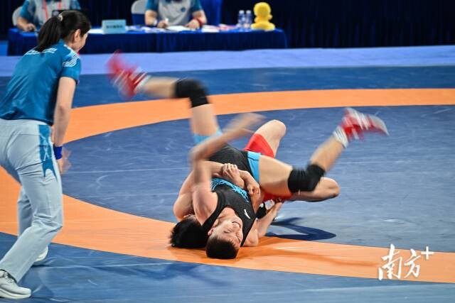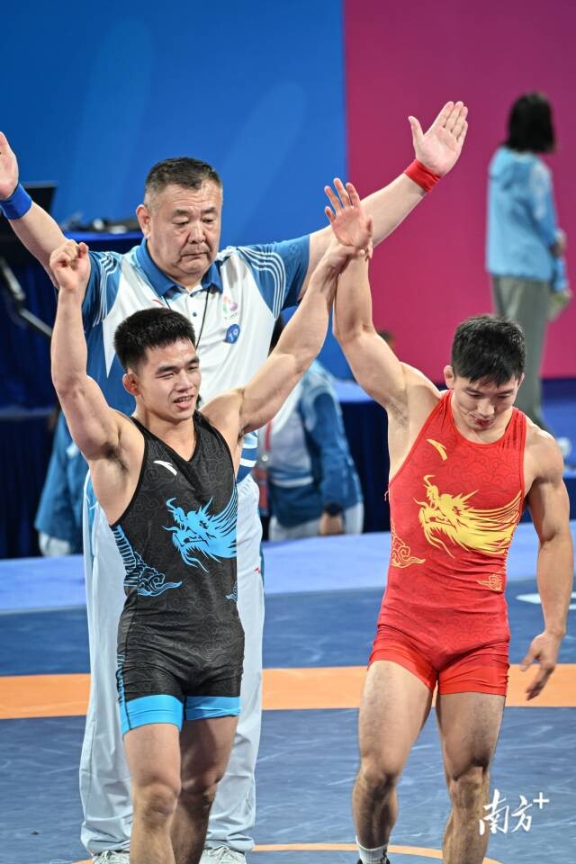 In the men's freestyle 57kg final, Guangxi teammates Liu Minghu (red) and Zou Wanhao (blue) meet in an all-Guangxi showdown and share a proud moment after the match.