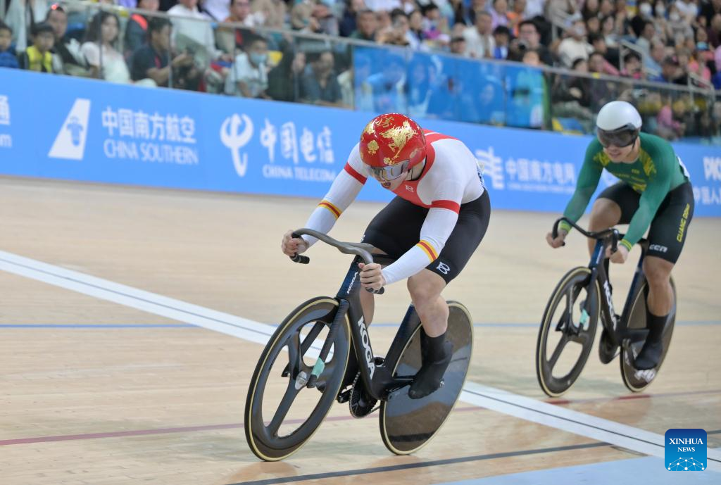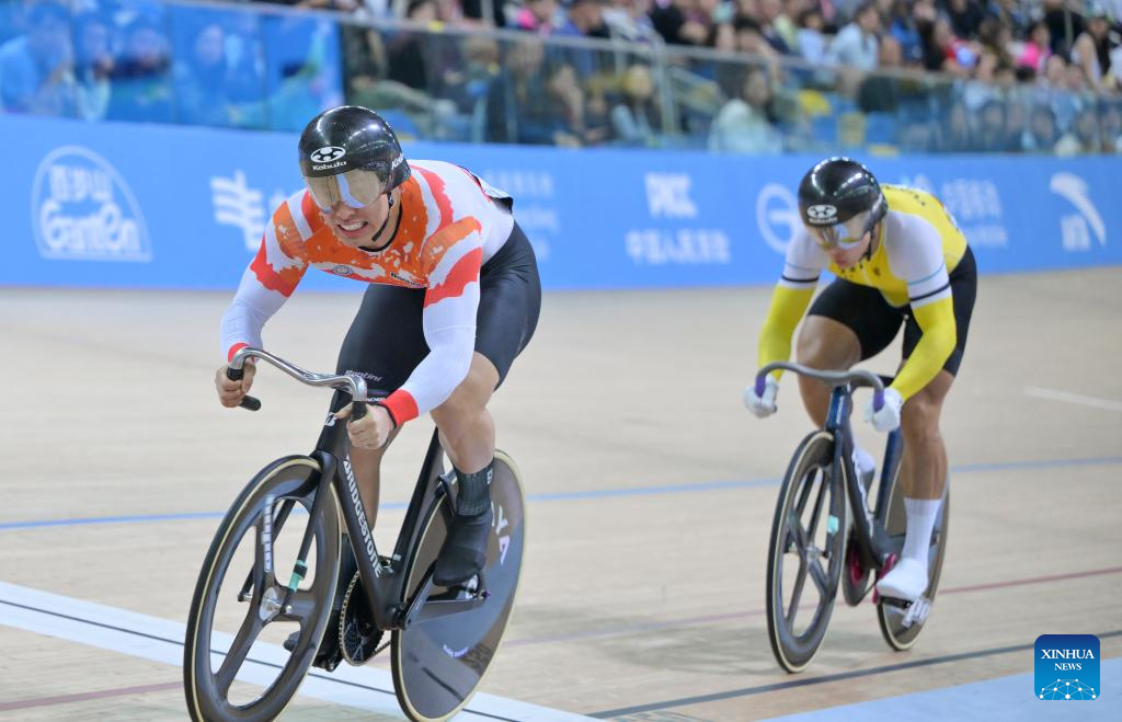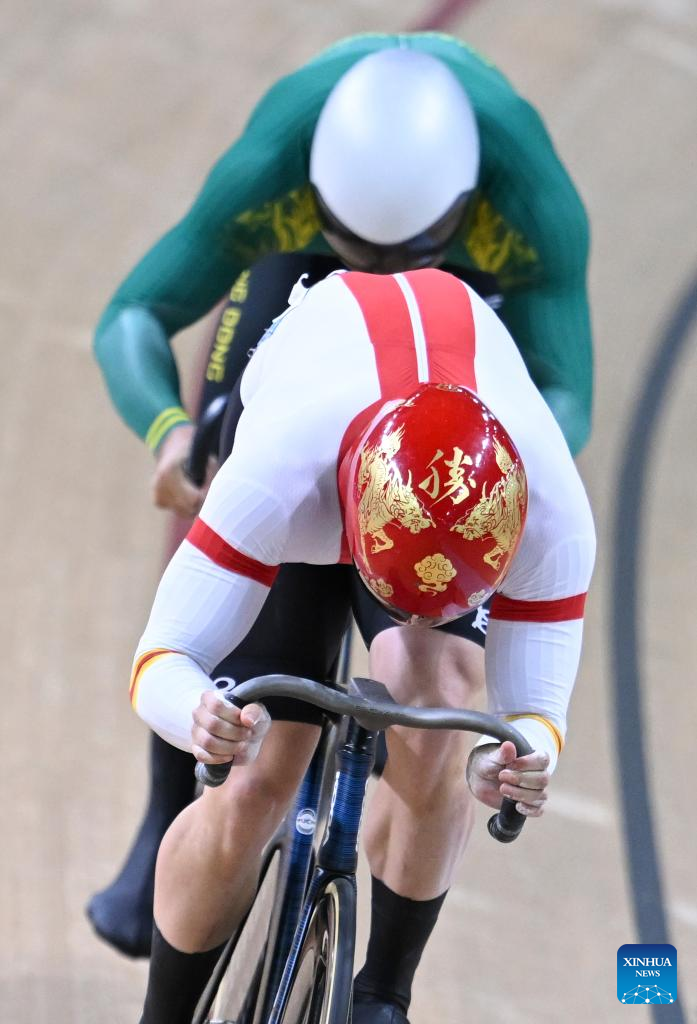 Xue Chenxi (L) of Hebei competes against Xie Han of Yunnan during the first round of cycling track men's sprint final at China's 15th National Games in Hong Kong, south China, Nov. 15, 2025. (Xinhua/Hu Huhu)