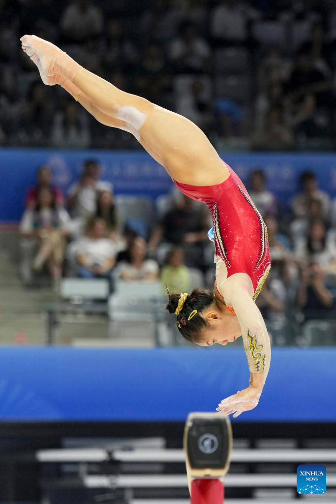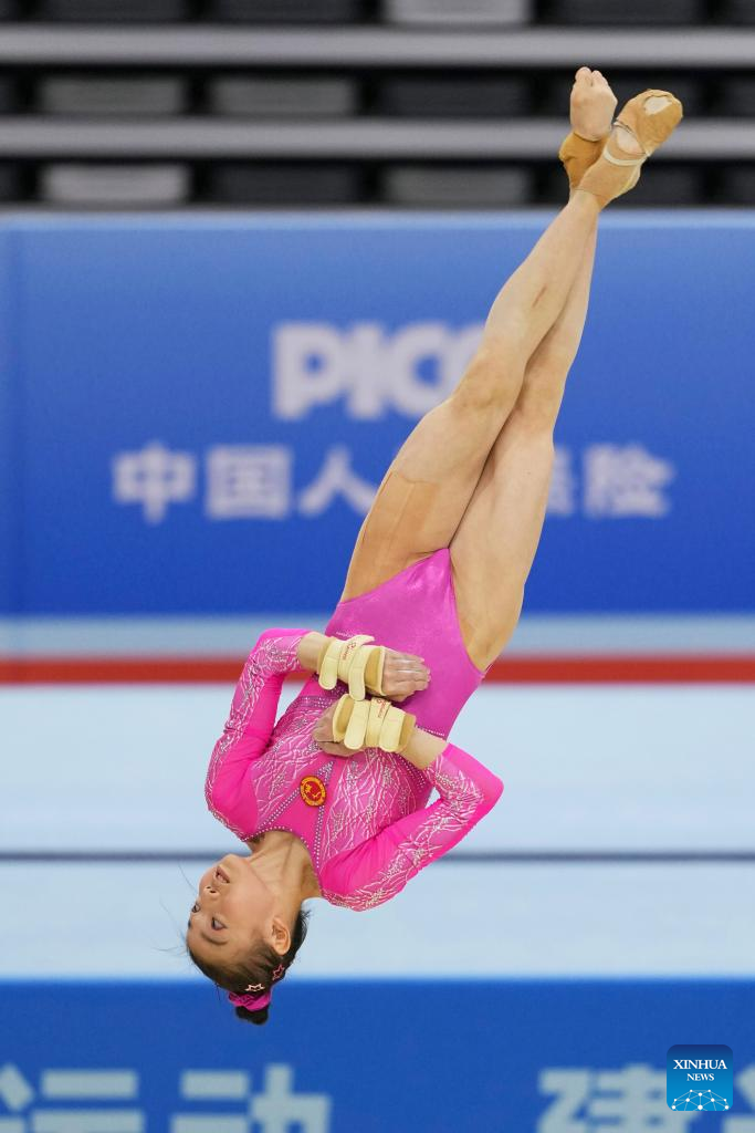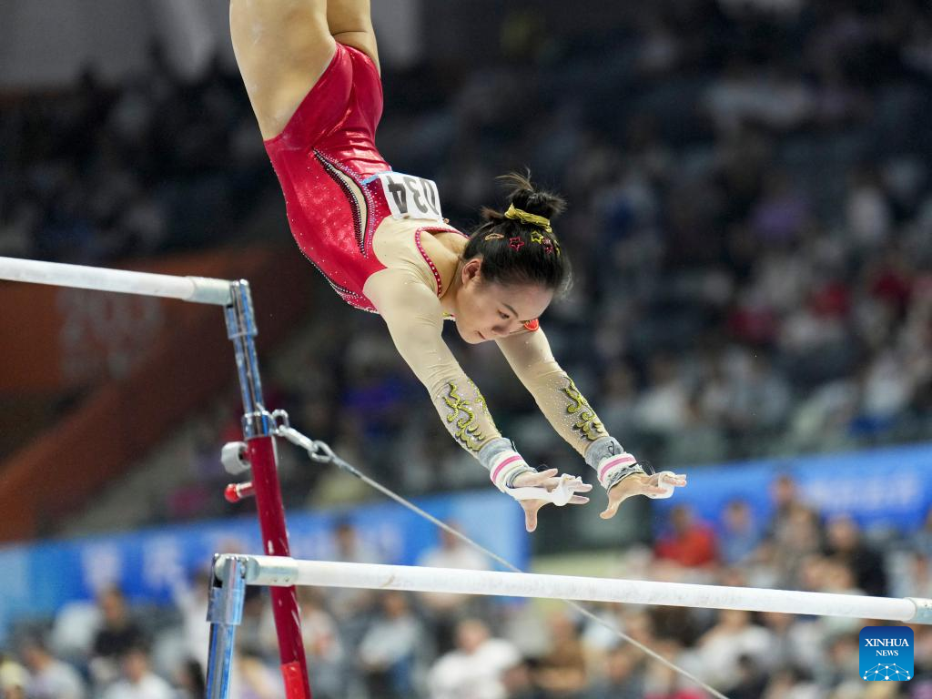 Zhang Qingying of Zhejiang competes in uneven bars during the artistic gymnastics women's individual all-around final at China's 15th National Games in Zhaoqing, south China's Guangdong Province, Nov. 15, 2025. (Xinhua/Xu Bingjie)