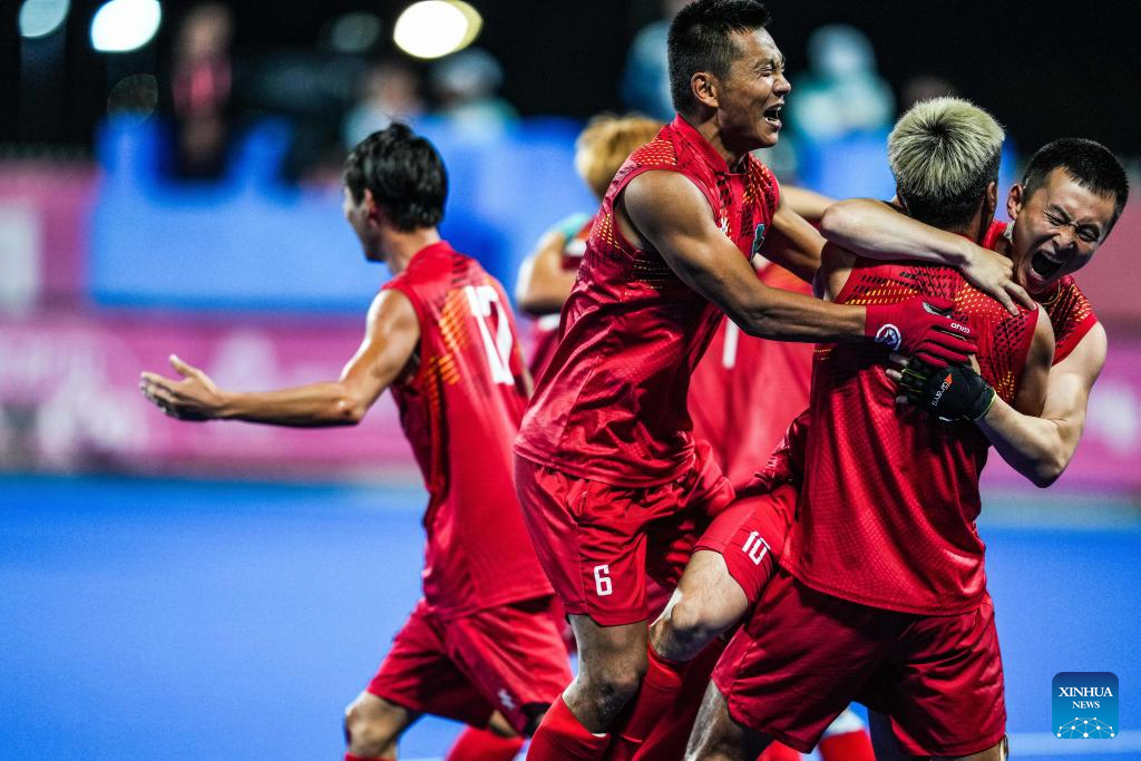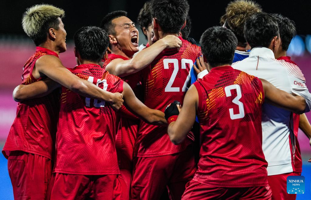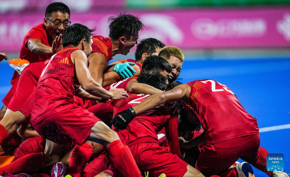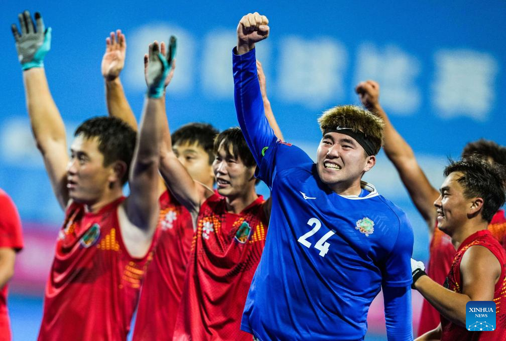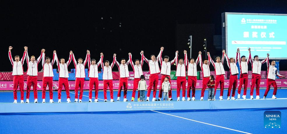 Players of Inner Mongolia celebrate after the men's hockey final between Guangdong and Inner Mongolia at China's 15th National Games in Yunfu, south China's Guangdong Province, Nov. 15, 2025. (Xinhua/Tao Liang)