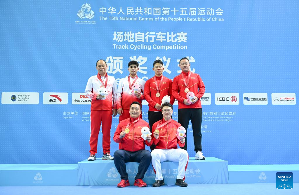 Gold medalist Liu Qi of Henan, silver medalist Li Zhiwei of Guangdong and bronze medalist Xue Chenxi of Hebei pose with their coaches during the awarding ceremony for cycling track men's sprint at China's 15th National Games in Hong Kong, south China, Nov. 15, 2025. (Xinhua/Hu Huhu)