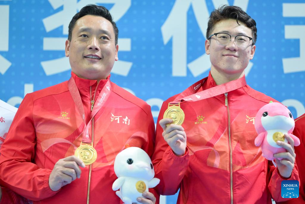 Gold medalist Liu Qi (R) of Henan poses with his coach during the awarding ceremony for cycling track men's sprint at China's 15th National Games in Hong Kong, south China, Nov. 15, 2025. (Xinhua/Hu Huhu)