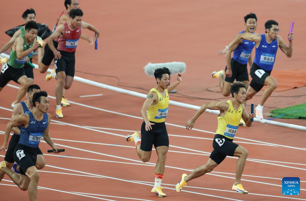 Athletes compete during the mixed 4x100m relay final of athletics at China's 15th National Games in Guangzhou, south China's Guangdong Province, Nov. 15, 2025. (Xinhua/Deng Hua)