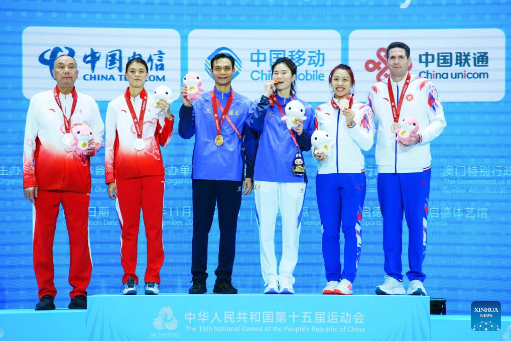 Gold medalist Lin Sheng of Fujian, silver medalist Wu Caiyao of Guangdong and bronze medalist Hsieh Kaylin Sin Yan of Hong Kong pose with their coaches during the awarding ceremony after the women's epee individual final of fencing at China's 15th National Games in Hong Kong, south China, Nov. 15, 2025. (Xinhua/Zhu Wei)