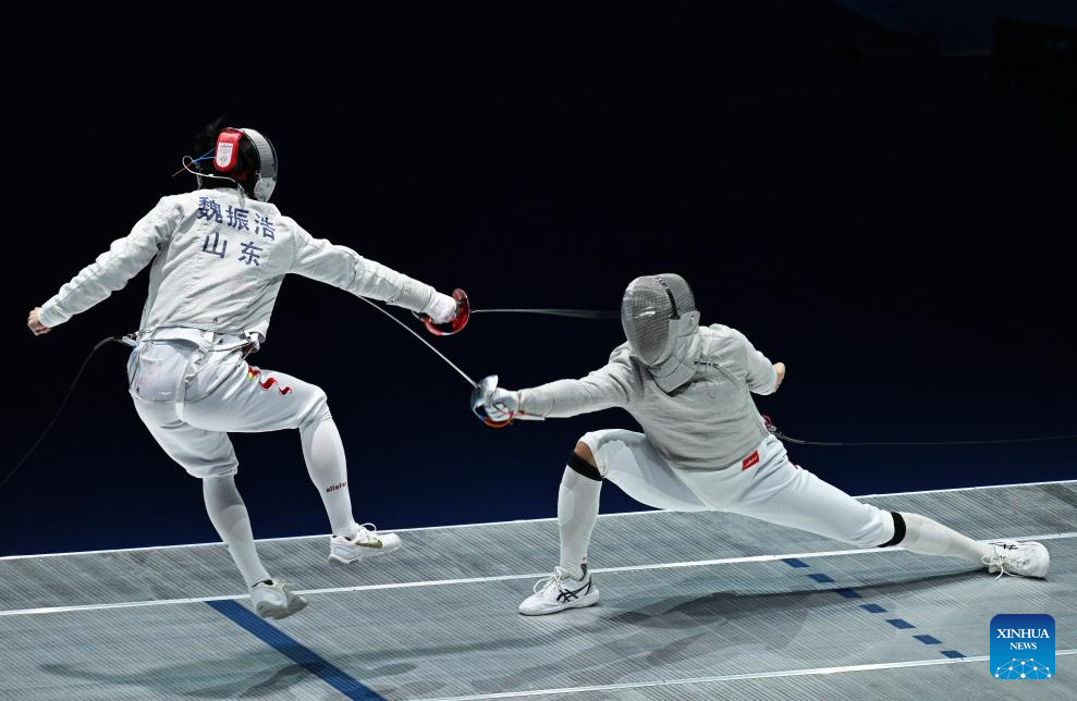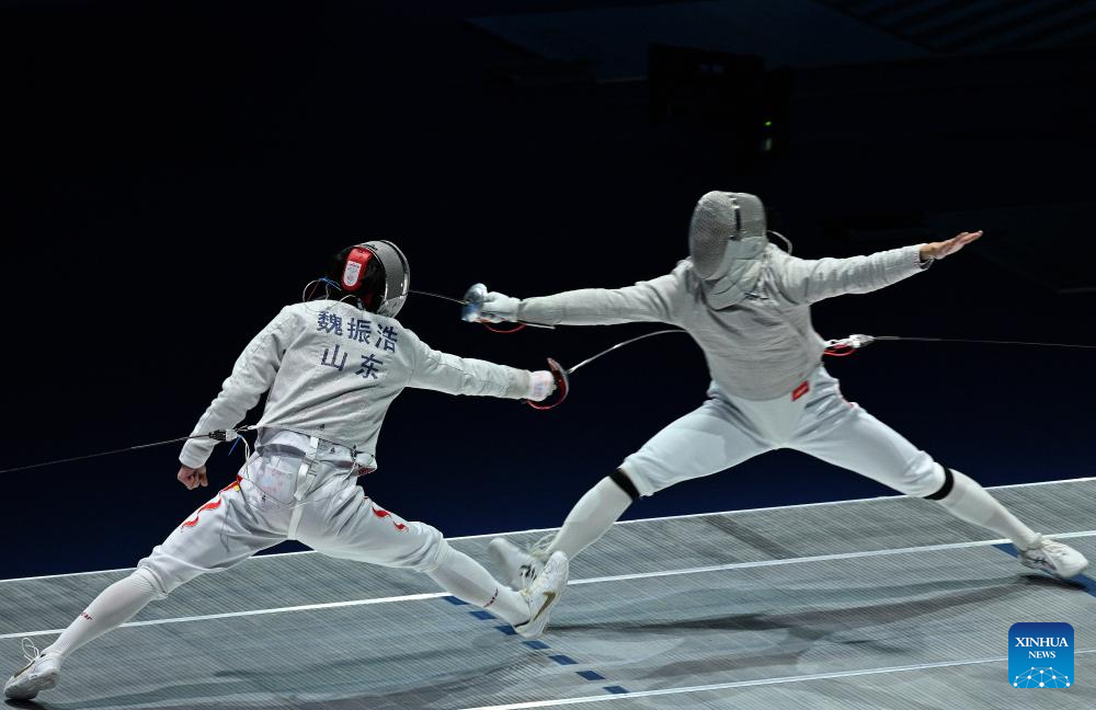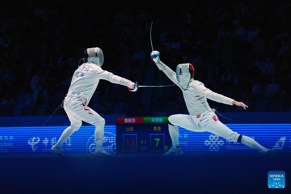 Wei Zhenhao (L) of Shandong competes against Ho Sze Long Aaron of Hong Kong during the men's sabre individual final of fencing at China's 15th National Games in Hong Kong, south China, Nov. 15, 2025. (Xinhua/Chen Duo)