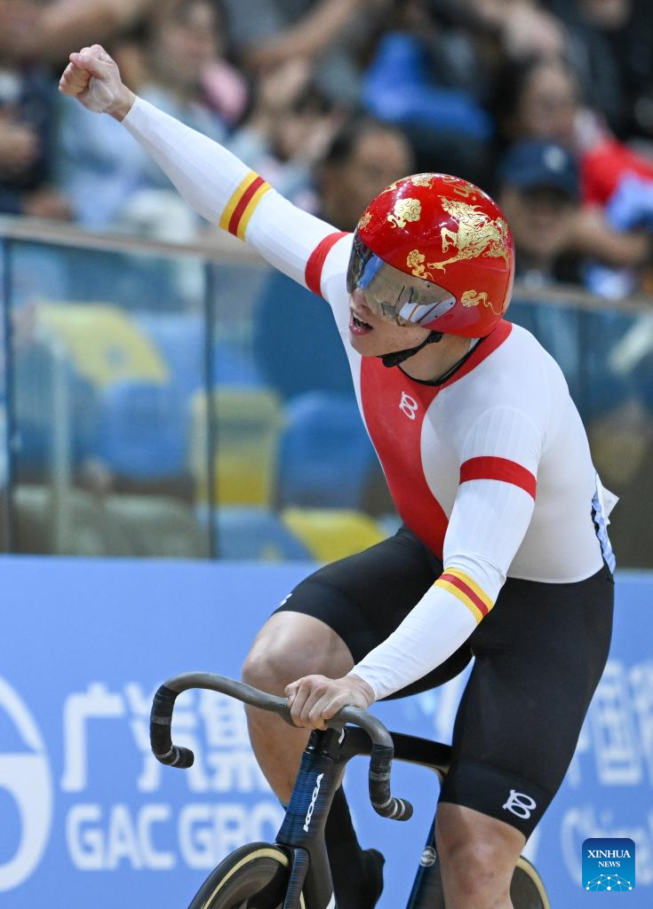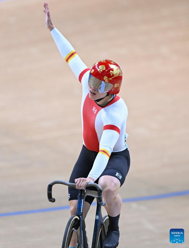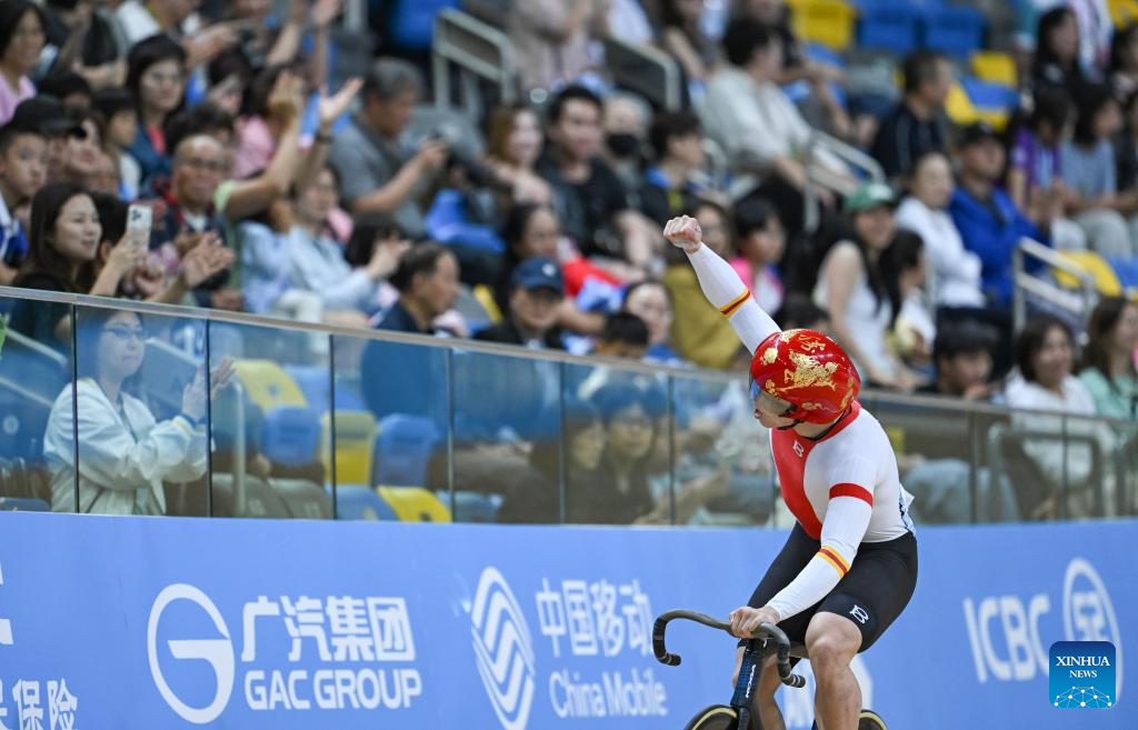 Liu Qi of Henan celebrates after winning the cycling track men's sprint final at China's 15th National Games in Hong Kong, south China, Nov. 15, 2025. (Xinhua/Hu Huhu)
