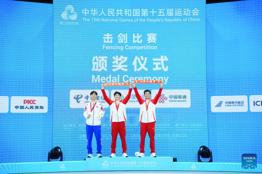 Gold medalist Wei Zhenhao of Shandong, silver medalist Ho Sze Long Aaron of Hong Kong and bronze medalist Zhe Peijie of Shandong pose during the awarding ceremony after the men's sabre individual final of fencing at China's 15th National Games in Hong Kong, south China, Nov. 15, 2025. (Xinhua/Zhu Wei)
