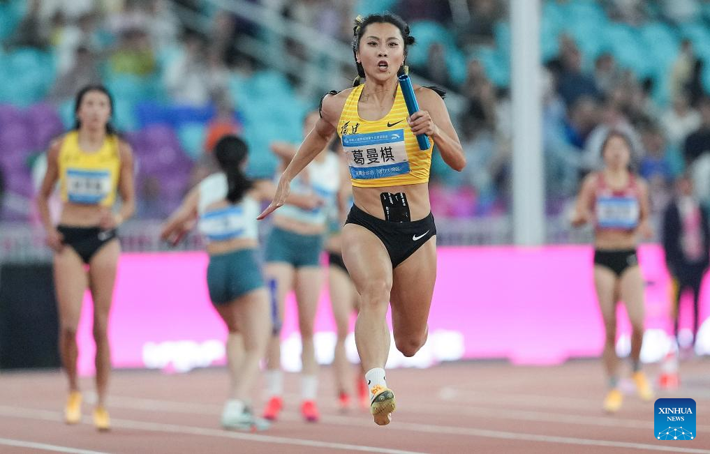 Ge Manqi of team Fujian competes during the mixed 4x100m relay final of athletics at China's 15th National Games in Guangzhou, south China's Guangdong Province, Nov. 15, 2025. (Xinhua/Li Yibo)