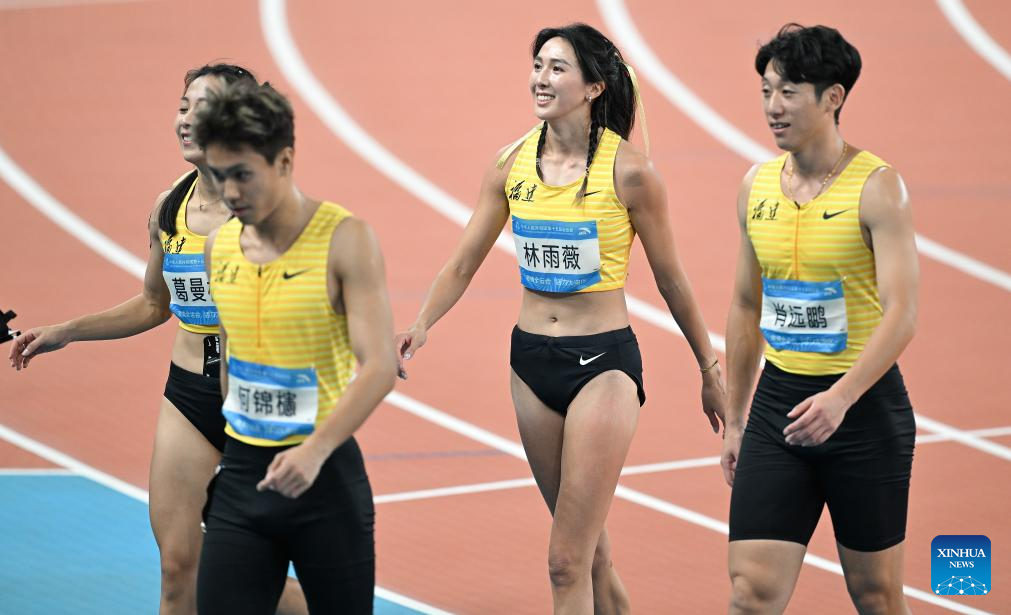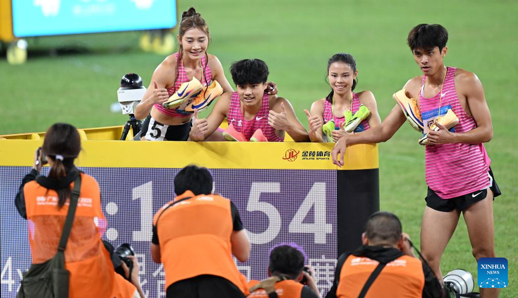 Athletes compete during the mixed 4x400m relay final of athletics at China's 15th National Games in Guangzhou, south China's Guangdong Province, Nov. 15, 2025. (Xinhua/Deng Hua)