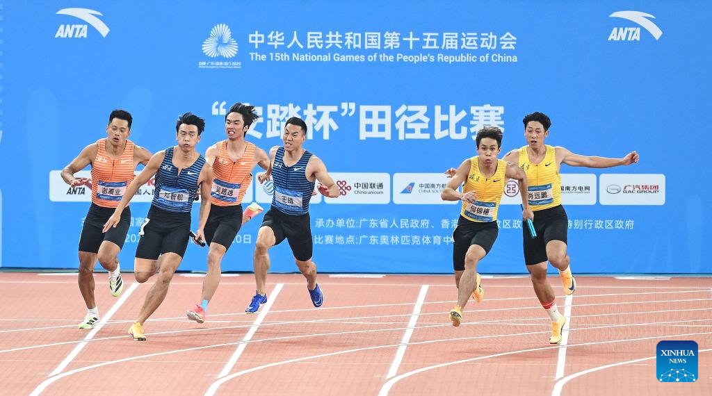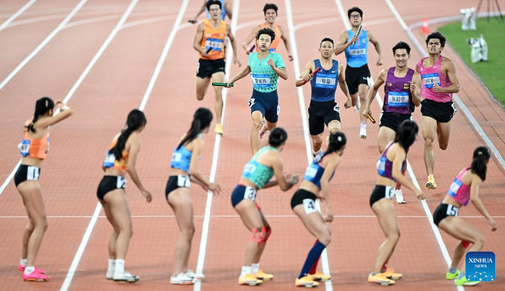 Athletes compete during the mixed 4x100m relay final of athletics at China's 15th National Games in Guangzhou, south China's Guangdong Province, Nov. 15, 2025. (Xinhua/Huang Wei)
