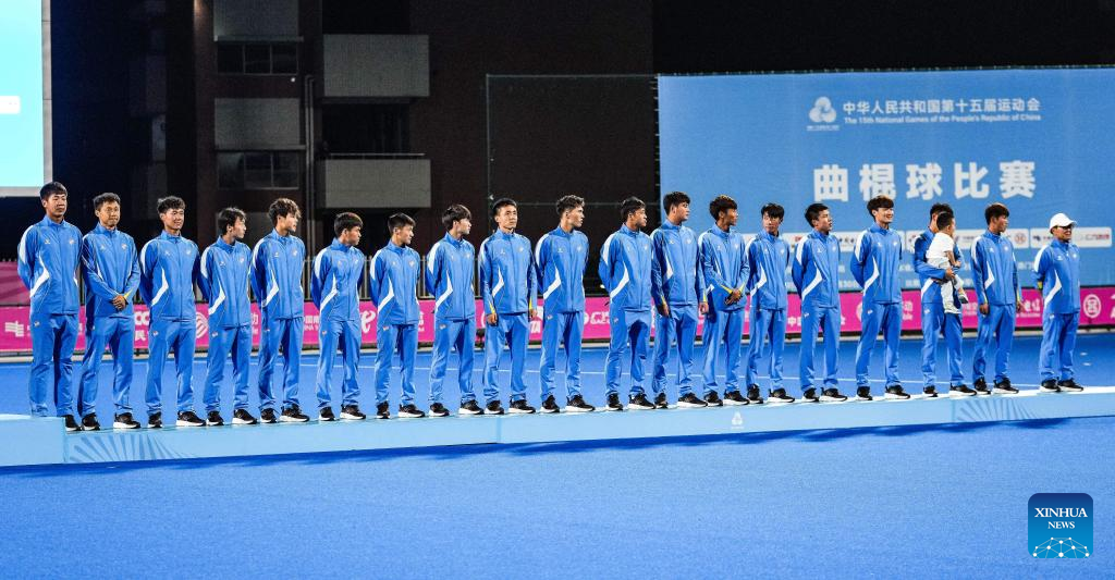 Gold medalists team Inner Mongolia celebrate during the awarding ceremony for the men's hockey at China's 15th National Games in Yunfu, south China's Guangdong Province, Nov. 15, 2025. (Xinhua/Tao Liang)