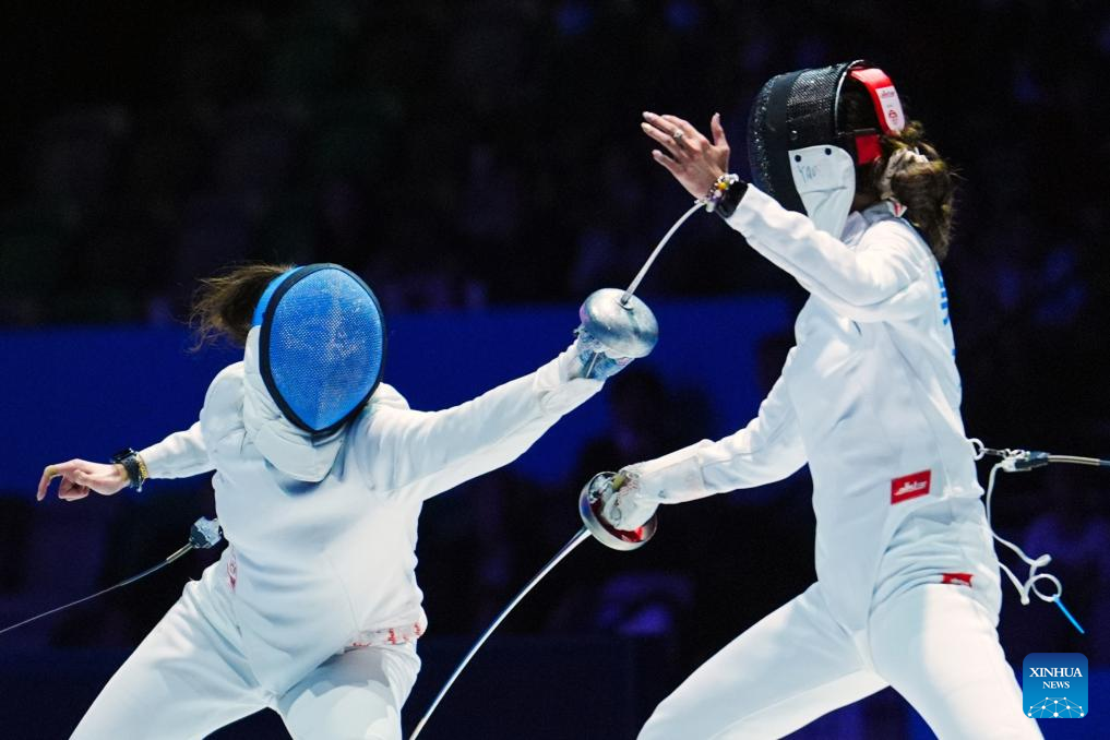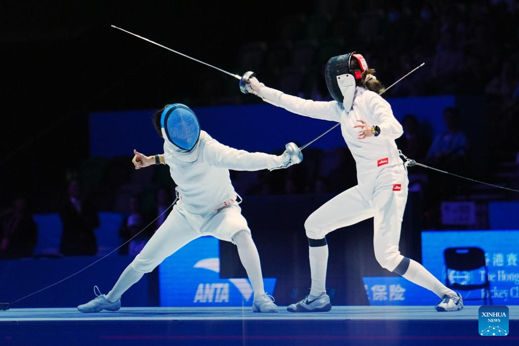 Lin Sheng (L) of Fujian competes against Wu Caiyao of Guangdong during the women's epee individual final of fencing at China's 15th National Games in Hong Kong, south China, Nov. 15, 2025. (Xinhua/Zhu Wei)