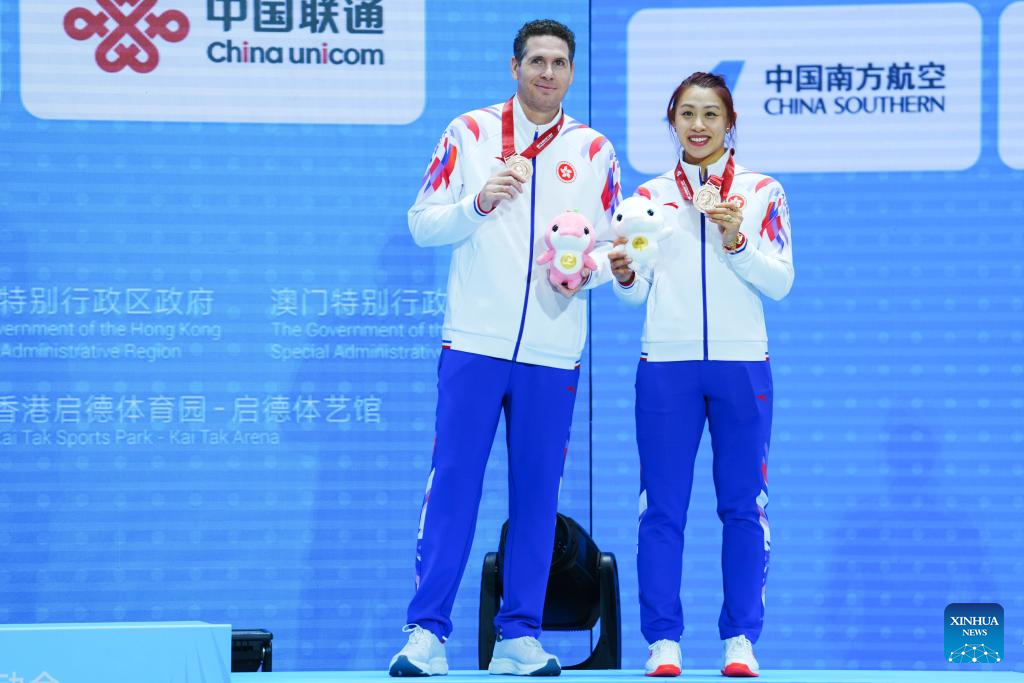 Bronze medalist Hsieh Kaylin Sin Yan of Hong Kong and her coach pose during the awarding ceremony after the women's epee individual final of fencing at China's 15th National Games in Hong Kong, south China, Nov. 15, 2025. (Xinhua/Zhu Wei)