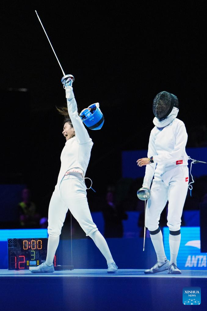 Lin Sheng (L) of Fujian celebrates after defeating Wu Caiyao of Guangdong during the women's epee individual final of fencing at China's 15th National Games in Hong Kong, south China, Nov. 15, 2025. (Xinhua/Zhu Wei)