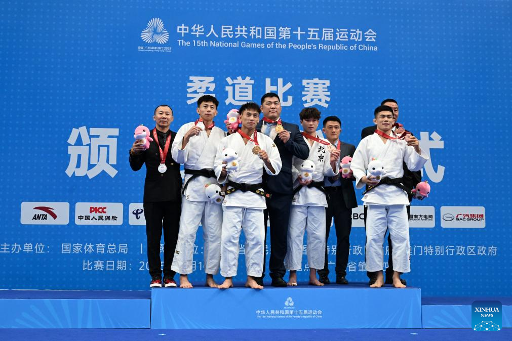 Gold medalist Xue Ziyang of Hebei, silver medalist Xiuduriga of Inner Mongolia, bronze medalist Zhang Minghao of Beijing and bronze medalist Tubuqigeqi of Shanxi pose for group photos with their coaches during the awarding ceremony of the men's Judo -66kg final at China's 15th National Games in Zhaoqing, south China's Guangdong Province, Nov. 10, 2025. (Xinhua/Zhu Xiang)