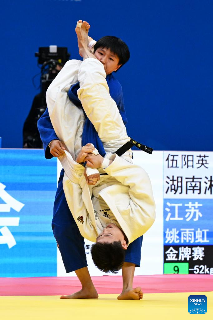 Wu Yangying (front) of Hunan competes against Yao Yuhong of Jiangsu during the women's Judo -52kg final at China's 15th National Games in Zhaoqing, south China's Guangdong Province, Nov. 10, 2025. (Xinhua/Zhu Xiang)